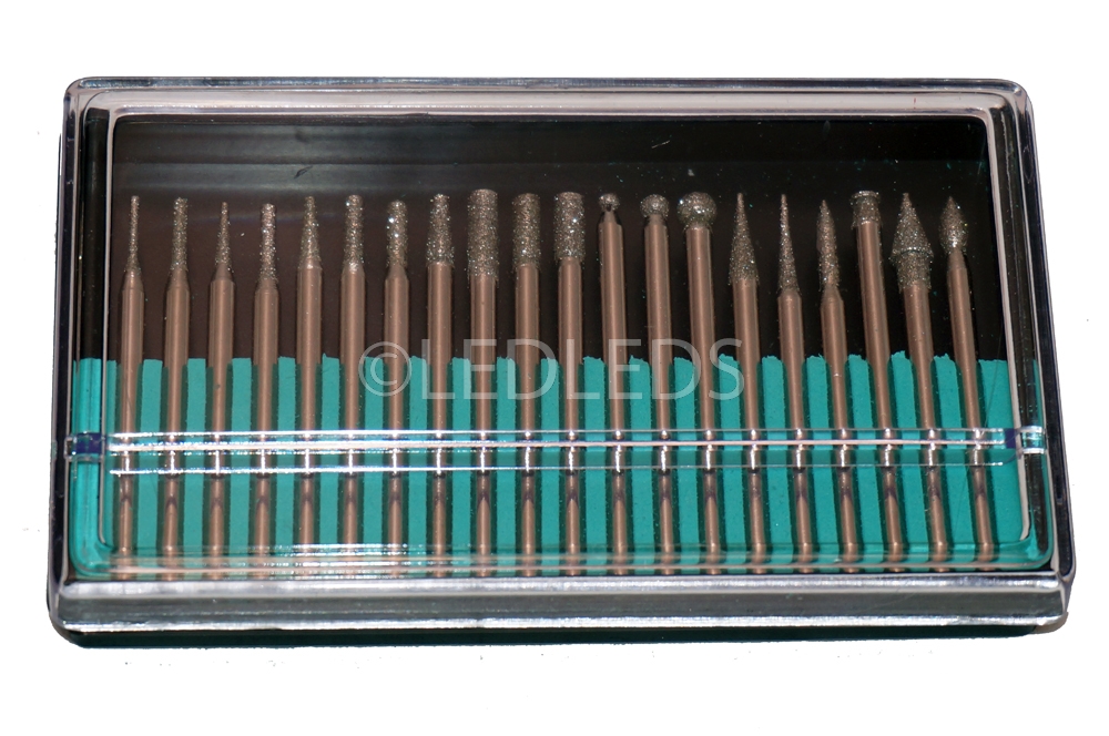 La serie è composta da varie forme, a disco, cilindrica, cilindrica a punta tonda, a cono appuntito, a cono troncato con punta arrotondata, a cono troncato con punta piatta, a cono invertito, sferiche ed a uovo. Ideali per dettagli, per tagliare, per incidere, per intagliare, per ritoccare e rifinire. Ottime per il legno, la giada, la ceramica, il vetro, l'acciaio temprato, le pietre semipreziose ed altri materiali duri. Le frese sono ricoperte con particelle di diamante. Diametro gambo: 3mm. Lunghezza: 45mm.