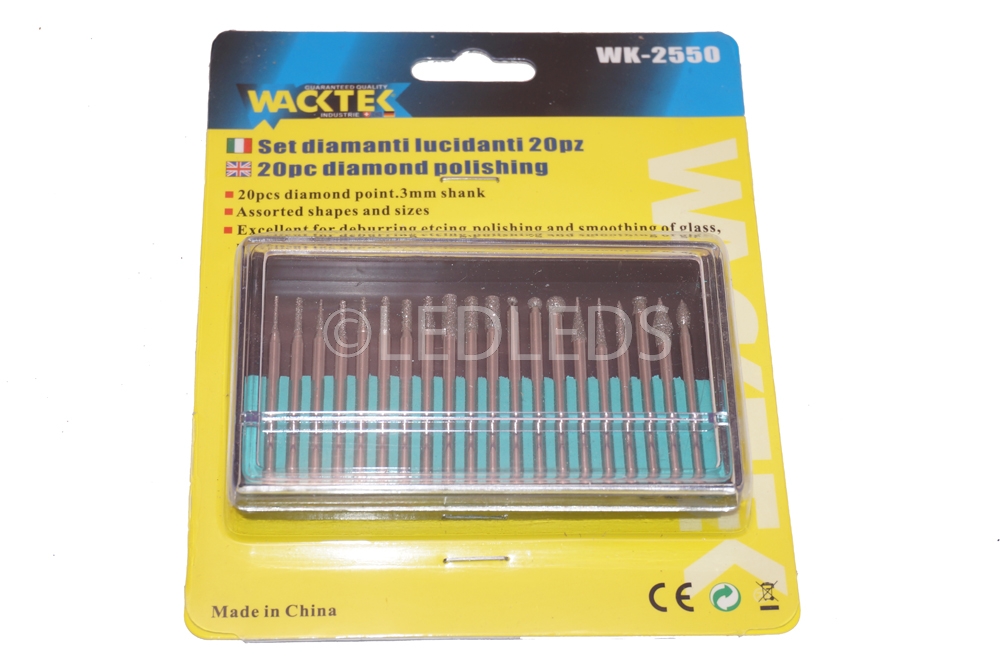 La serie è composta da varie forme, a disco, cilindrica, cilindrica a punta tonda, a cono appuntito, a cono troncato con punta arrotondata, a cono troncato con punta piatta, a cono invertito, sferiche ed a uovo. Ideali per dettagli, per tagliare, per incidere, per intagliare, per ritoccare e rifinire. Ottime per il legno, la giada, la ceramica, il vetro, l'acciaio temprato, le pietre semipreziose ed altri materiali duri. Le frese sono ricoperte con particelle di diamante. Diametro gambo: 3mm. Lunghezza: 45mm.