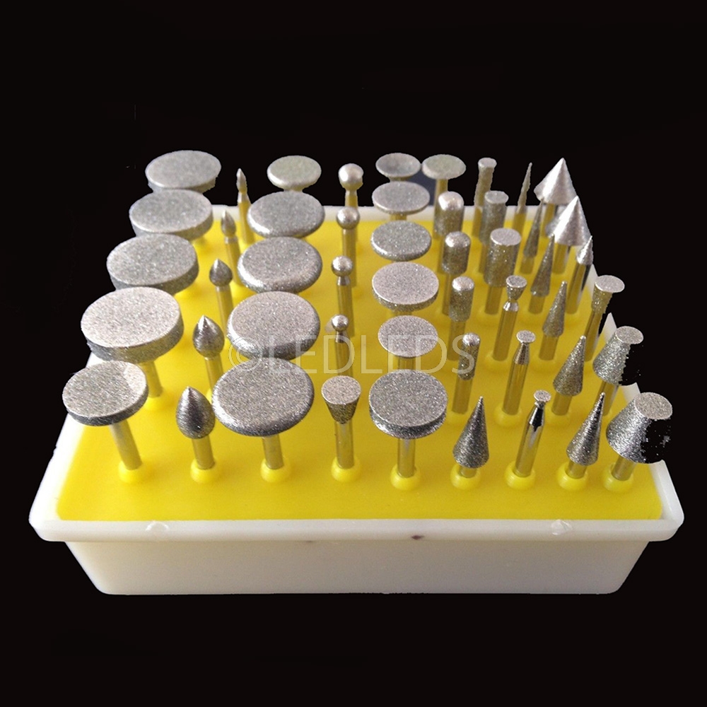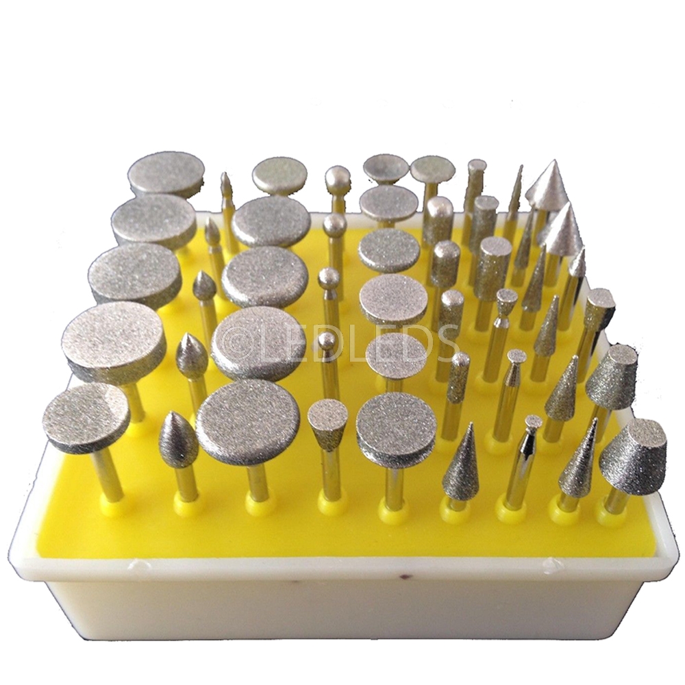 Il set è composto da varie forme, a disco, cilindrica, cilindrica a punta tonda, a cono appuntito, a cono troncato con punta arrotondata, a cono troncato con punta piatta, a cono invertito, sferiche ed a uovo. Ideali per dettagli, per tagliare, per incidere, per intagliare, per ritoccare e rifinire. Ottime per il legno, la giada, la ceramica, il vetro, l'acciaio temprato, le pietre semipreziose ed altri materiali duri. Le frese sono ricoperte con particelle di diamante. Diametro gambo: 3 mm. Lunghezza: 46 mm