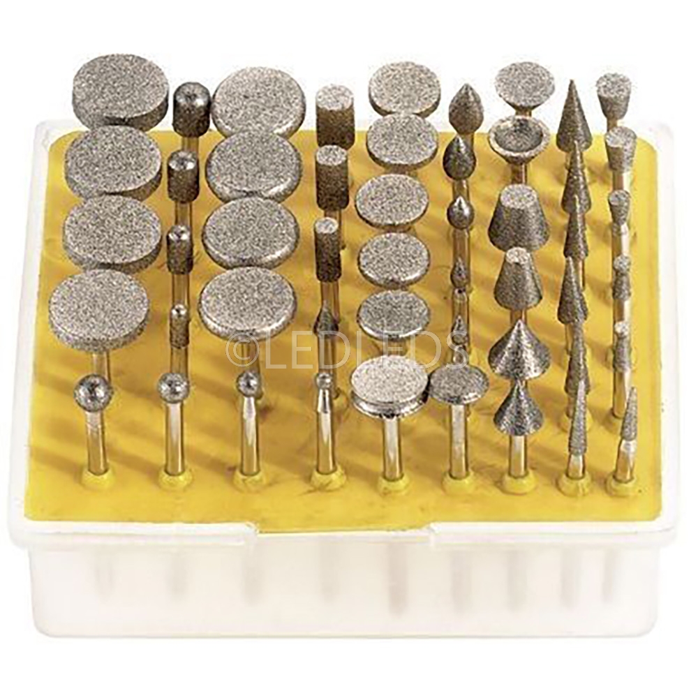 Il set è composto da varie forme, a disco, cilindrica, cilindrica a punta tonda, a cono appuntito, a cono troncato con punta arrotondata, a cono troncato con punta piatta, a cono invertito, sferiche ed a uovo. Ideali per dettagli, per tagliare, per incidere, per intagliare, per ritoccare e rifinire. Ottime per il legno, la giada, la ceramica, il vetro, l'acciaio temprato, le pietre semipreziose ed altri materiali duri. Le frese sono ricoperte con particelle di diamante. Diametro gambo: 3 mm. Lunghezza: 46 mm