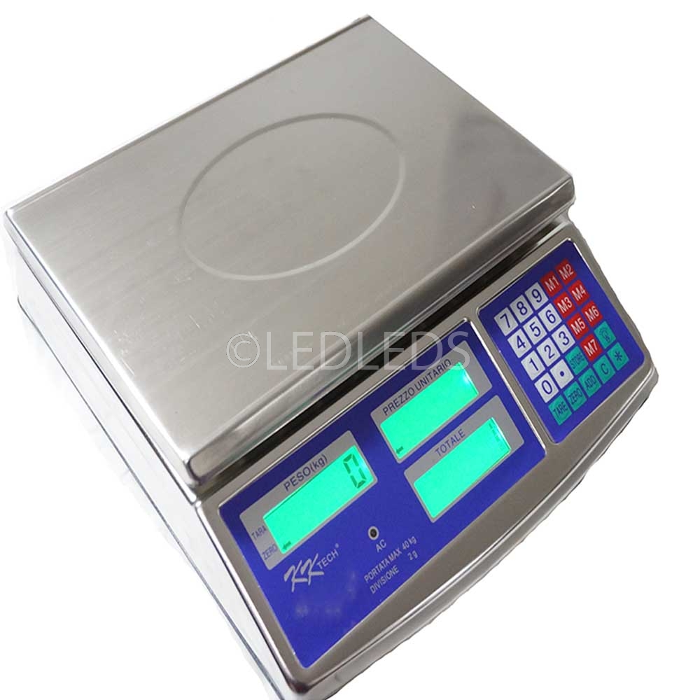 ILANCIA DIGITALE PROFESSIONALE CON DISPLAY DIGITALE E CONTROLLO DEI PREZZI, PIANO PESA MERCE IN ACCIAIO INOX, TASTI DI MEMORIA, MEMORIZZAZIONE DEI PREZZI AL KG FINO A 8 memorie, IMPOSTANDO IL PREZZO AL KG SI CONOSCERA' ANCHE IL COSTO DELLA MERCE PESATA, AUTOTARATURA, UTILISSIMO FUNZIONAMENTO ANCHE A BATTERIA PER AMBULANTI O IN CASO DI ASSENZA CORRENTE ELETTRICA.