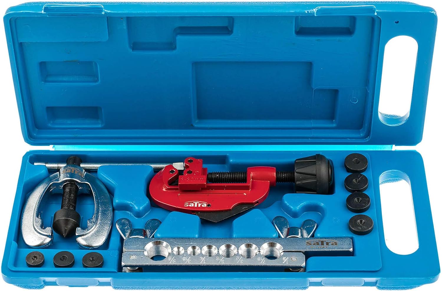 Utensile svasatore con adattatore 3/16", 1/4", 5/16", 3/8", 7/16", 5/8", 1/2 e tagliatubi per tutti i comuni sistemi di frenata,