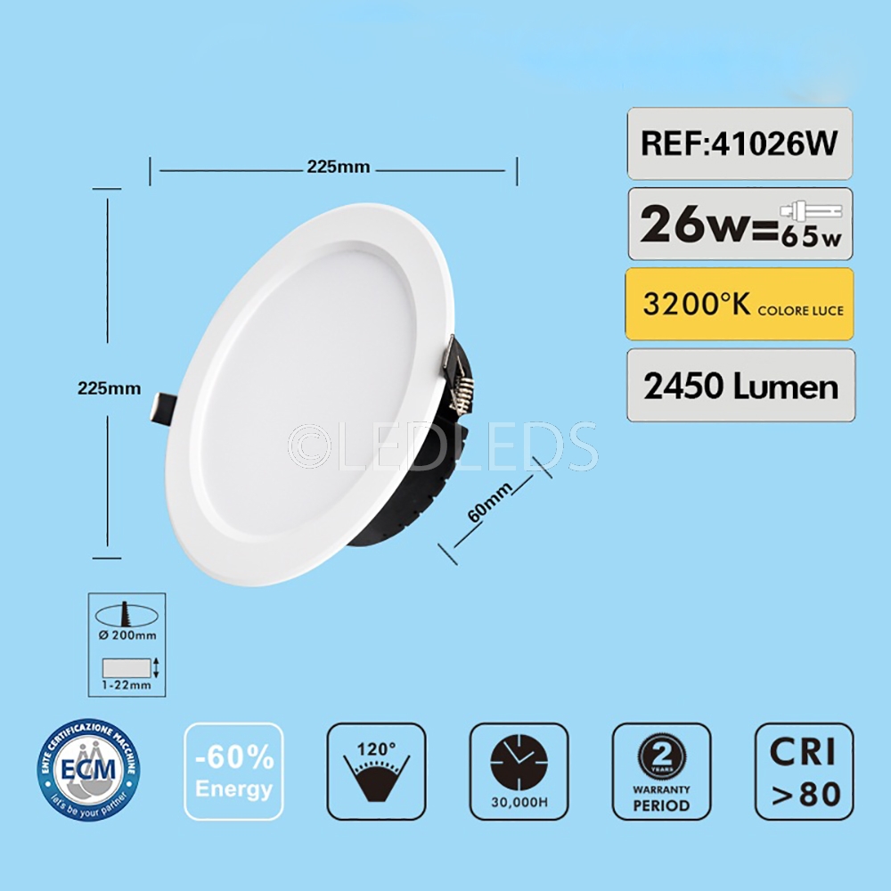 • FARETTO LED PANNELLO INCASSO ROTONDO 26W FORO 22 CM LUCE CALDA 3200K 220V