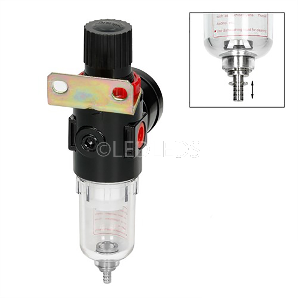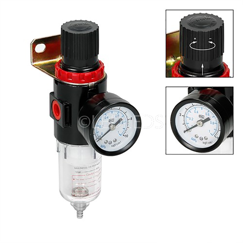 Fornisce pulita, aria, secca regolata compressa. Previene danni costosi utensili pneumatici causati da scala, ruggine e umidità. Installazione semplice significa tempi minimi di fermo. 1/4 "filettatura interna BSP max di lavoro 10bar Pressione (145psi)... Regolabile gamma di pressione 0.5-8.5bar Reservoir capacità 150ml.