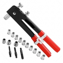 Fissaggio permanente e affidabile. Maniglie con impugnatura morbida per rivetti filettati in materiali sottili. Uso per lamiera, plastica e fibra di vetro. Include adattatori 4 mm, 5 mm, 6 mm 8mm