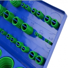 Un set professionale di O-ring per condizionamento con diametri dei fori da 3,15 a 50 mm e spessori di 1,8, 2,65 e 3,5 mm.
