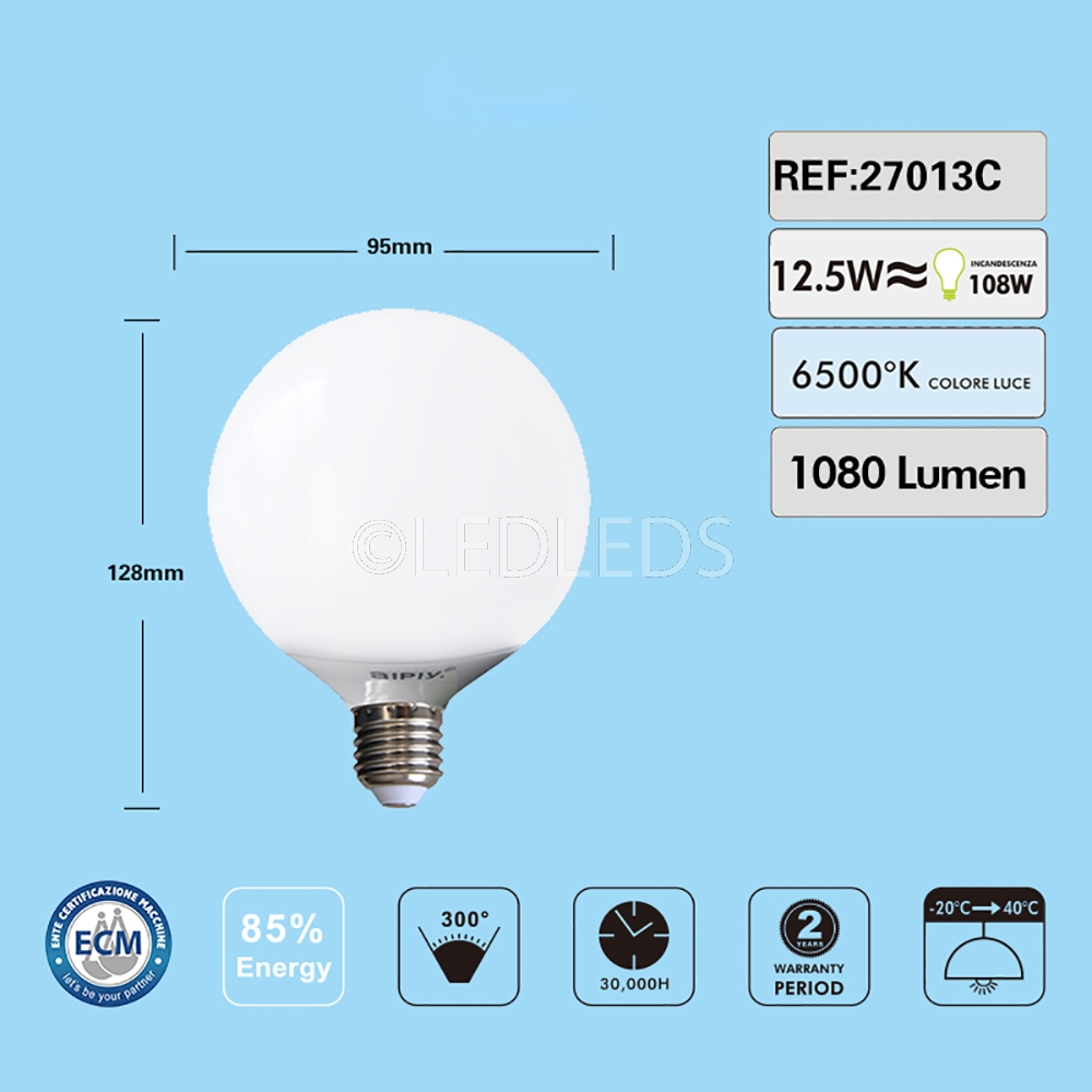 Lampadina Led a Globo E27 Passo Grosso 12,5W Led a Sfera Luce fredda