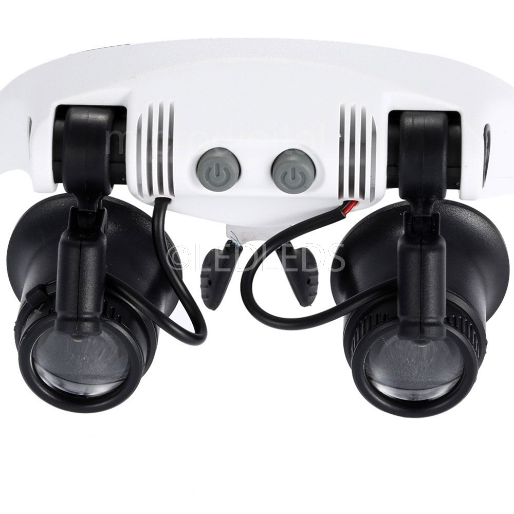 Occhiali per lavori di precisione dotati di lenti d'ingrandimento per effettuare manutenzione e riparazioni su piccoli oggetti di elettronica, oreficeria, gioielleria, per riparare orologi. Dotati di doppia lente per occhio destro e sinistro ingrandisce fino a 25x. Possibilità di utilizzarli anche come monocolo. Angolo di inclinazione regolabile per una messa a fuoco ottimale, dotati di spot luminosi a LED attivabili mediante interruttore con LED ad alta luminosità e inoltre anch'essi inclinabile, alimentati da 3 batterie AAA NON INCLUSE