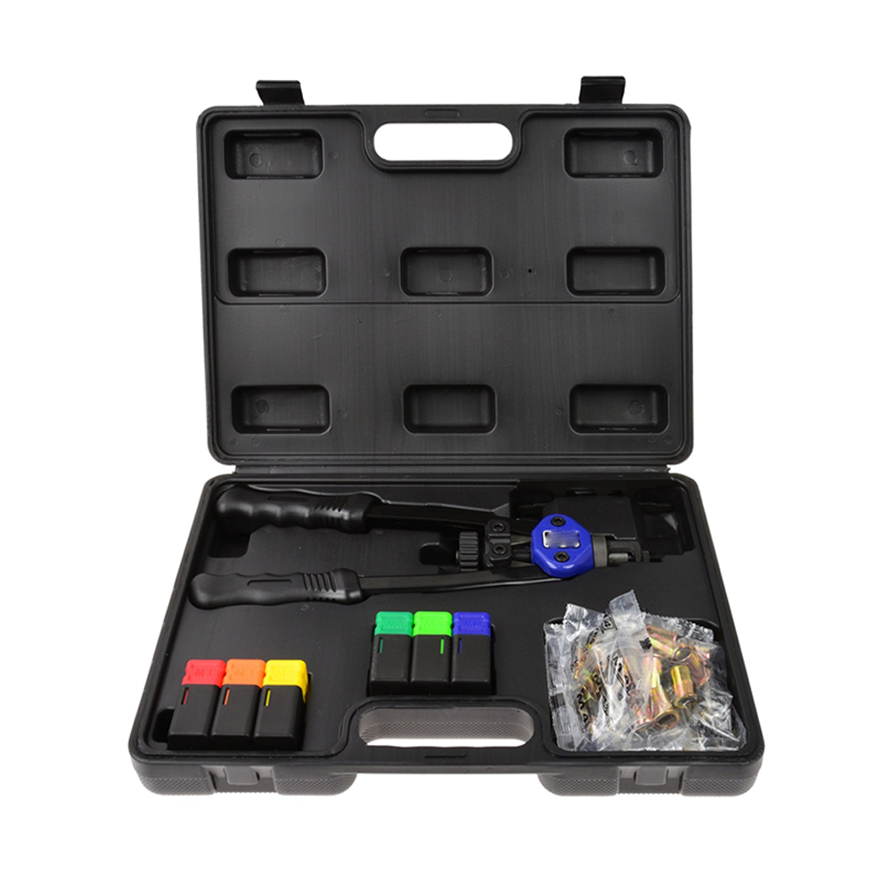 Rivettatrice a leva progettata per unire vari materiali con dadi rivetti . La rivettatrice è realizzata con materiali di altissima qualità . Dotato di un set di cinque teste nelle taglie: M3, M4, M5, M6, M8, M10. L'uso di dadi per rivetti consente di avvitare elementi aggiuntivi con una vite delle dimensioni di un dado per rivetti.