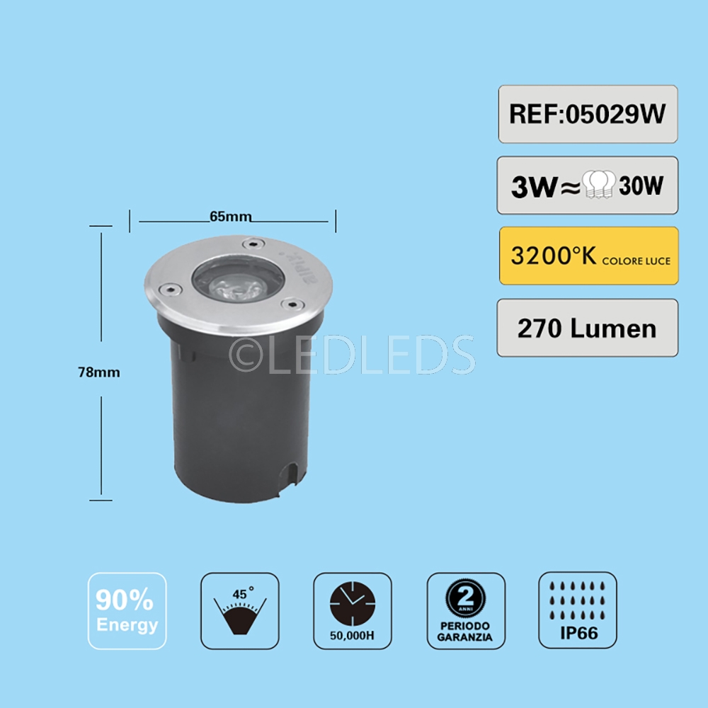 Home Page / ILLUMINAZIONE LED PER ESTERNI / SEGNAPASSO MINI FARETTO CALPESTABILE 1 LED 3 WATT SVILUPPA 30 220V LUCE CALDA /