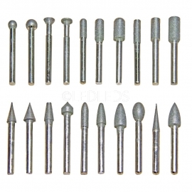 La serie è composta da varie forme, a disco, cilindrica, cilindrica a punta tonda, a cono appuntito, a cono troncato con punta arrotondata, a cono troncato con punta piatta, a cono invertito, sferiche ed a uovo. Ideali per dettagli, per tagliare, per incidere, per intagliare, per ritoccare e rifinire. Ottime per il legno, la giada, la ceramica, il vetro, l'acciaio temprato, le pietre semipreziose ed altri materiali duri. Le frese sono ricoperte con particelle di diamante. Diametro gambo: 6mm. Lunghezza: 60mm.
