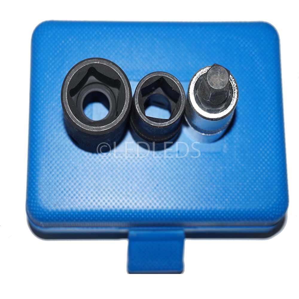 Set di tre chiavi a bussola con profilo pentagonale per lo smontaggio delle pinze freno vetture Opel, Ford, Peugeot, Renault, Smart.