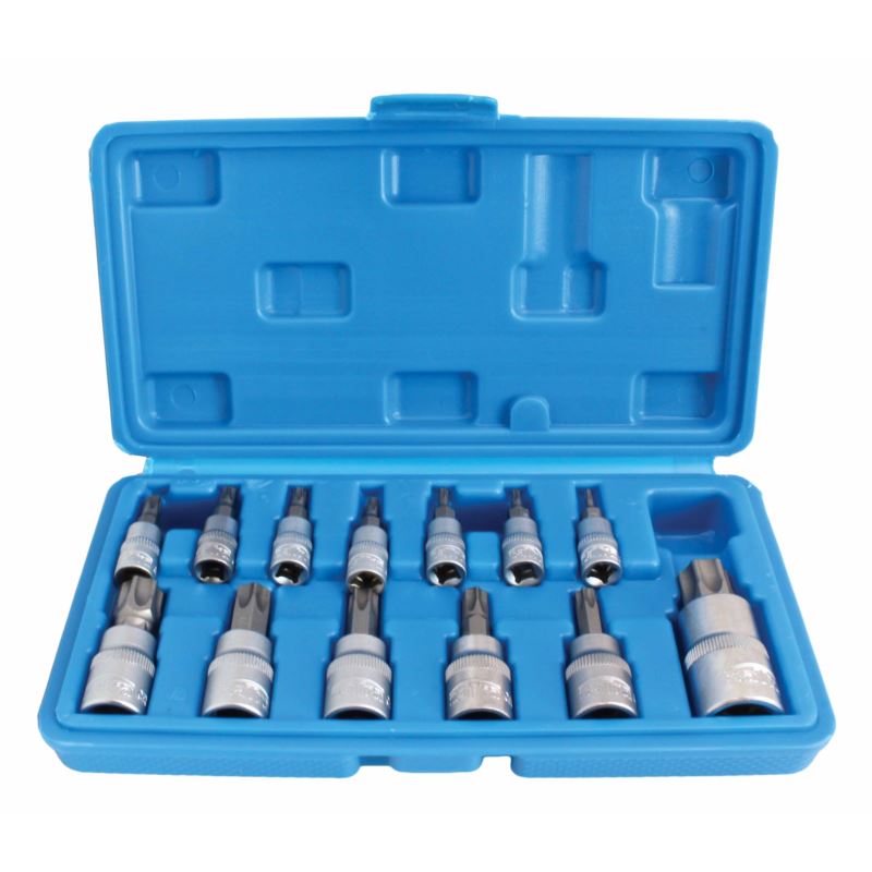 Set di 13 punte a bussola standard a stella/Torx® da utilizzare con cricchetto da 1/4", 3/8", 1/2" o barra di prolunga. Realizzate in acciaio al cromo vanadio (Cr-V) temprato e temperato con finitura opaca. Ogni punta è dotata di anello zigrinato per una presa e prestazioni extra. Fornite in una pratica custodia.