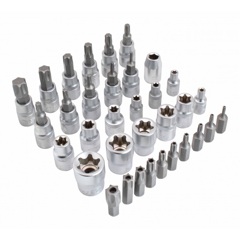 34 pezzi bussola femmina a stella/Torx, punte a bussola e punte con inserto di sicurezza da utilizzare con cricchetto da 1/4", 3/8", barra di prolunga o adattatori per punte con inserto da 8 mm.