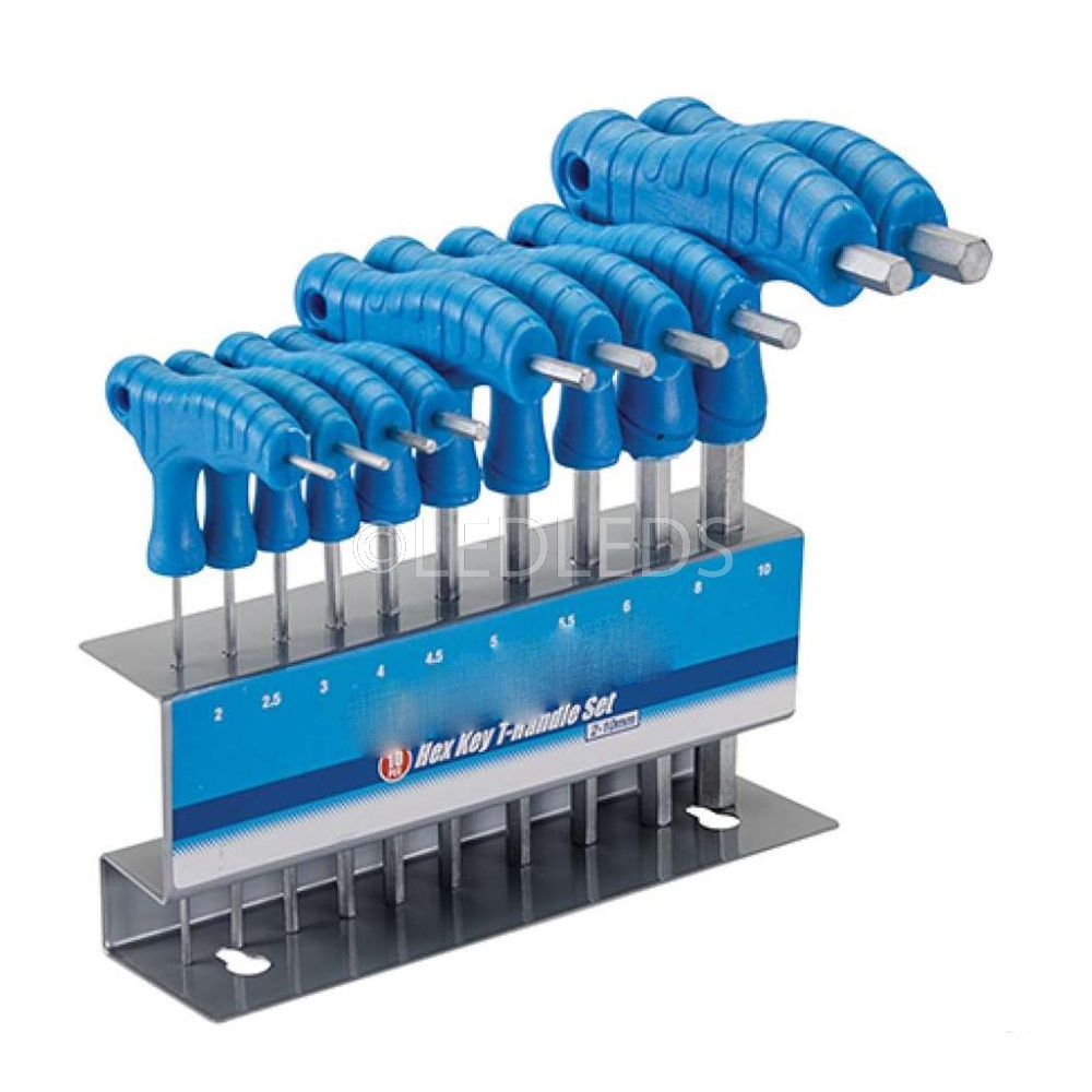 Cromo vanadio. Chiavi metriche ed esagonali a doppio attacco di tipo T . Taglie: 2, 2.5, 3, 4, 4.5, 5, 5.5, 6, 8 e 10 mm