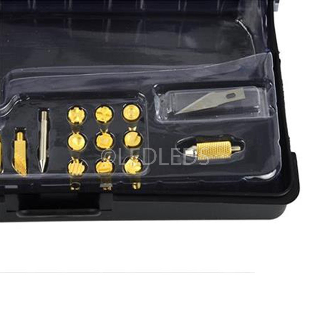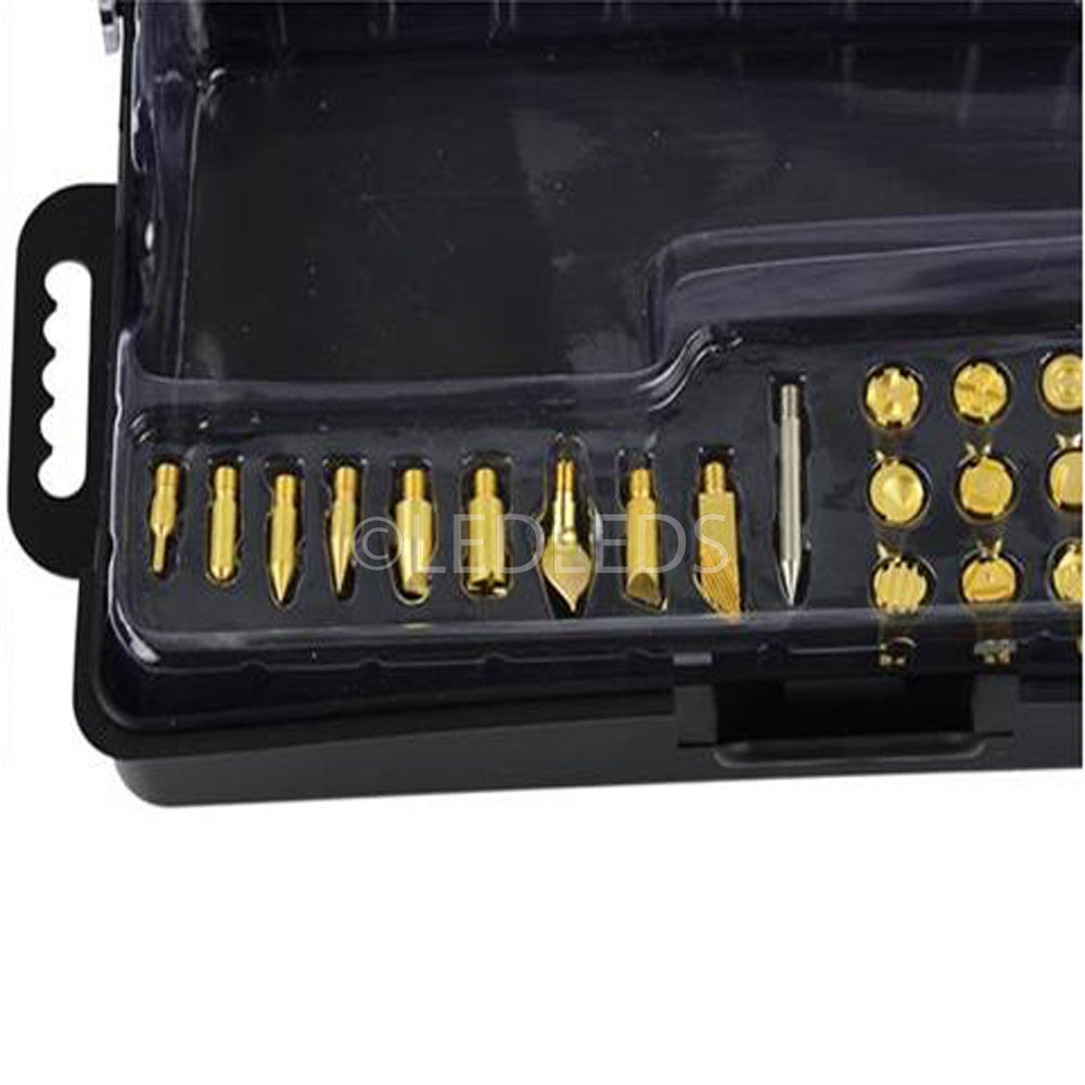 Saldatore con 22 punte differenti. Adatto per lavori di saldatura del legno, lavorazione del legno, hobby e lavorazione. Anche per la combustione del legno, pirografia, incisione, intaglio, goffratura, scritte e decorazioni su legno, pelliccia, sughero e cuoio.
