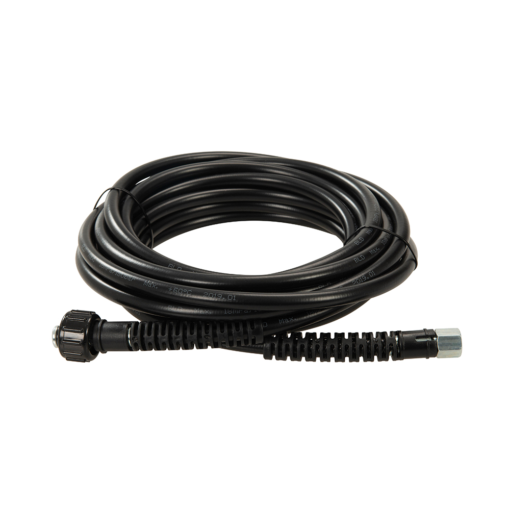 Tubo flessibile nodo-resistente di alta qualità prodotto da PVC. Compatibile con la maggior parte delle idropulitrici e lance, con raccordi filettati per vite. Max pressione di 160 bar.